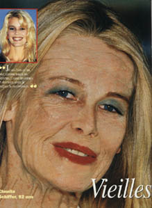 Aujourd’hui, j’ai feuilleté Voici. J’y ai découvert d’effroyables images d’Estelle Halliday, Elle Macpherson, Claudia Schiffer et Cindy Crawford transformées en grand-mères. Ces photos ne présentaient pas les vrais visages des tops, mais des portraits retouchés et vieillis à la palette graphique.