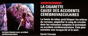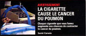 Pour les fumeurs canadiens, depuis décembre 2000, les cigarettes ne sont pourtant plus tout à fait les mêmes. Une nouvelle loi sur le tabac force les fabricants de cigarettes à afficher une série d’avertissements avec photos imprimées à l’extérieur des paquets.