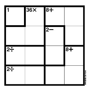 Un même chiffre n’apparaît qu’une seule fois dans chaque ligne et chaque colonne. A l’intérieur de chaque bloc délimité en gras, la combinaison des différentes cases doit être égale au chiffre indiqué dans le coin supérieur gauche. A côté de cet objectif figure l’opération à mobiliser afin d’y parvenir. Pour autant qu’il ne soit pas aligné, un même chiffre peut apparaître plusieurs fois dans un même bloc.