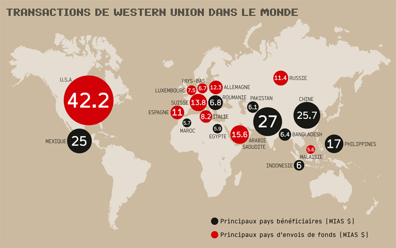 La Western Union assure l’envoi de fonds «cash to cash», c’est-à-dire en espèces. En quelques minutes, les billets donnés par un émetteur sont disponibles à l’autre bout de la planète dans la devise du receveur. Un système particulièrement efficace dans les pays en développement, notamment en Afrique, où le taux de bancarisation demeure très faible.