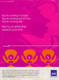 Profil fuchsia sur fond rose d’une jeune femme aux cils délicieusement recourbés et cheveux au vent chez SAS (Scandinavian Airlines).